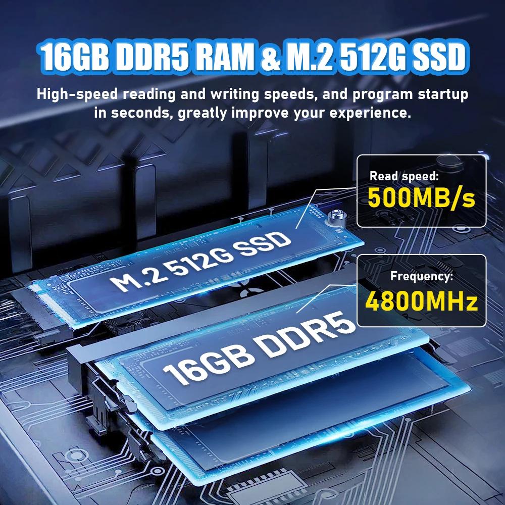 Large memory means smoother operation. To ensure a smooth experience, KP100 comes standard with 16GB DDR5 memory and 512G ssd, which provide faster read and write speeds, giving you a better user experience.