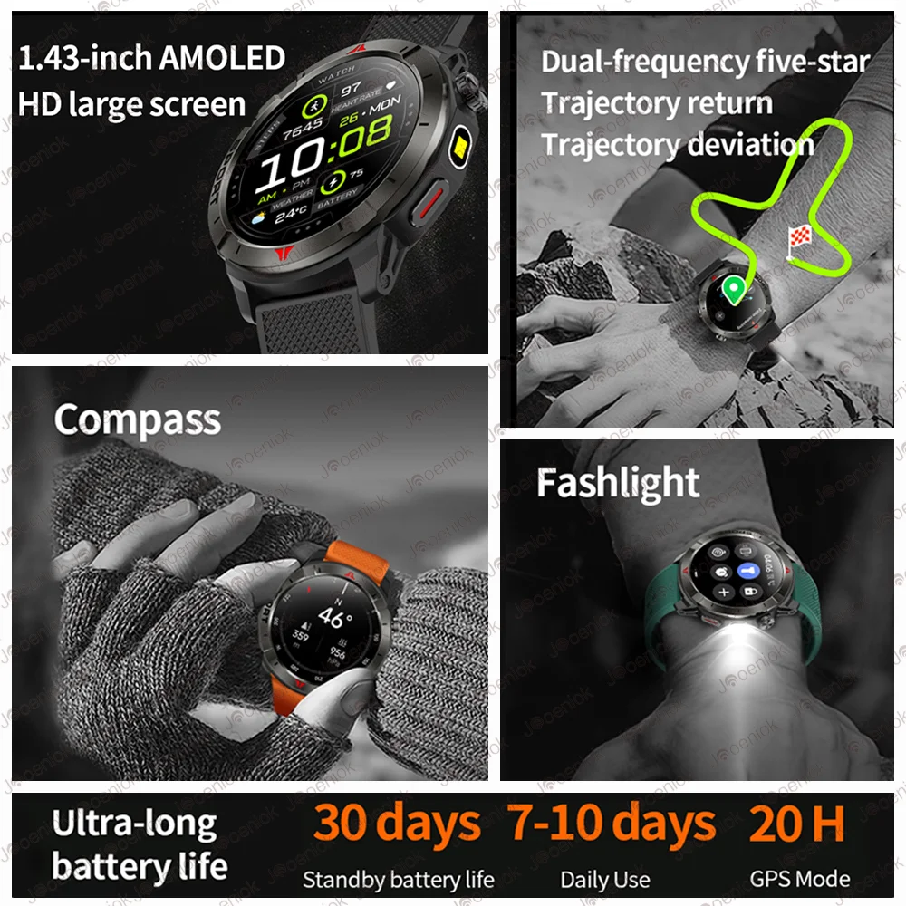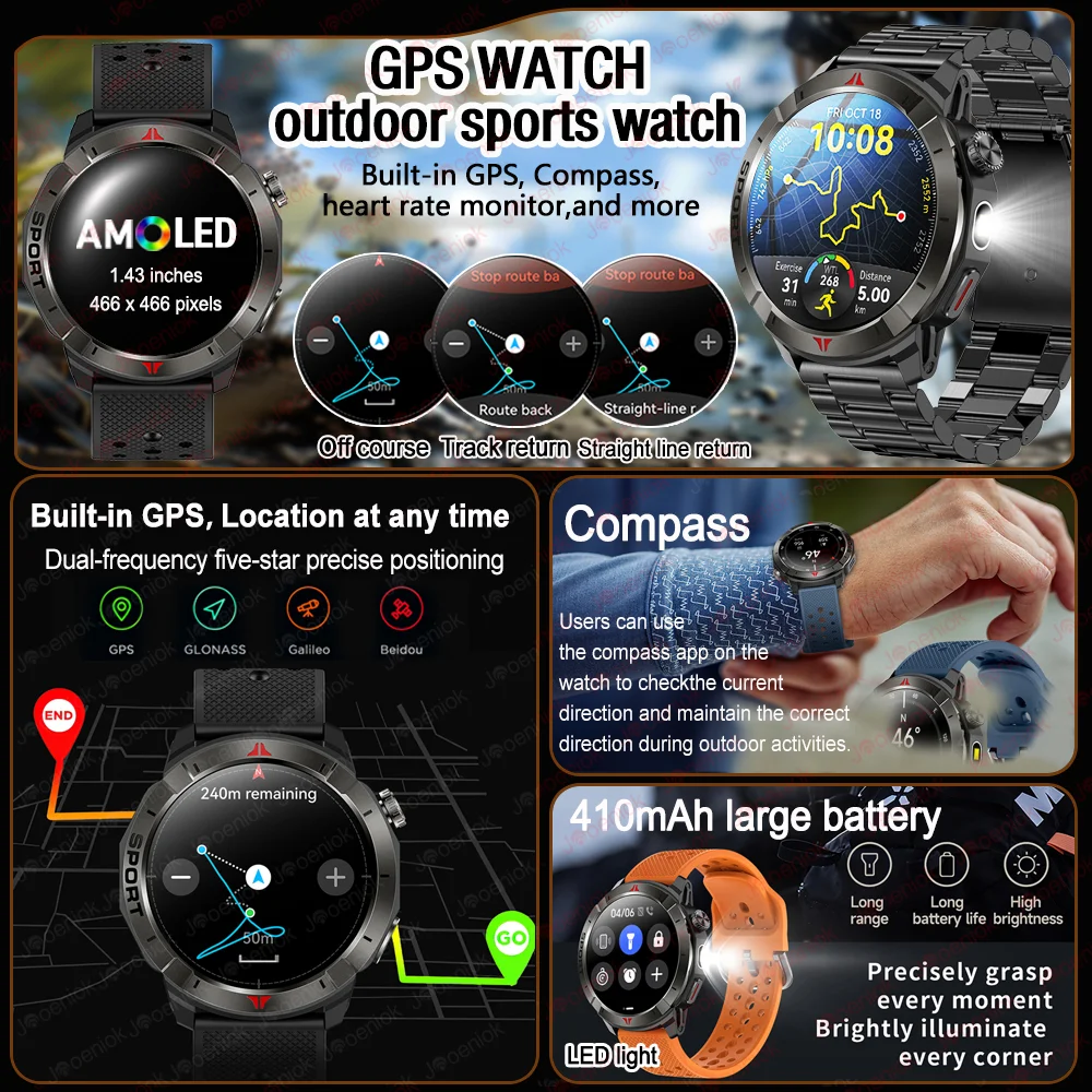 New Built-in GPS Smart Watch 1.43″ Amoled HD Display Compass LED Light Outdoor Sports 410mAh Large Battery BT Call SmartWatch