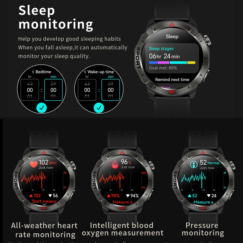 Barometer + Altitude, Compass, Flashlight, GPS Location, Heart Rate Monitor, Oxygen Monitor, Sleep Monitor, Breathing, Stress, Walking, Running, Cycling, Hiking and other multi-sport types. Walking, running, cycling, hiking and other multi-sport types, Bluetooth call, Bluetooth music, Bluetooth photo, voice assistant, message notification, reminder notification, women’s health, world clock, alarm clock, stopwatch, timer, weather, calculator