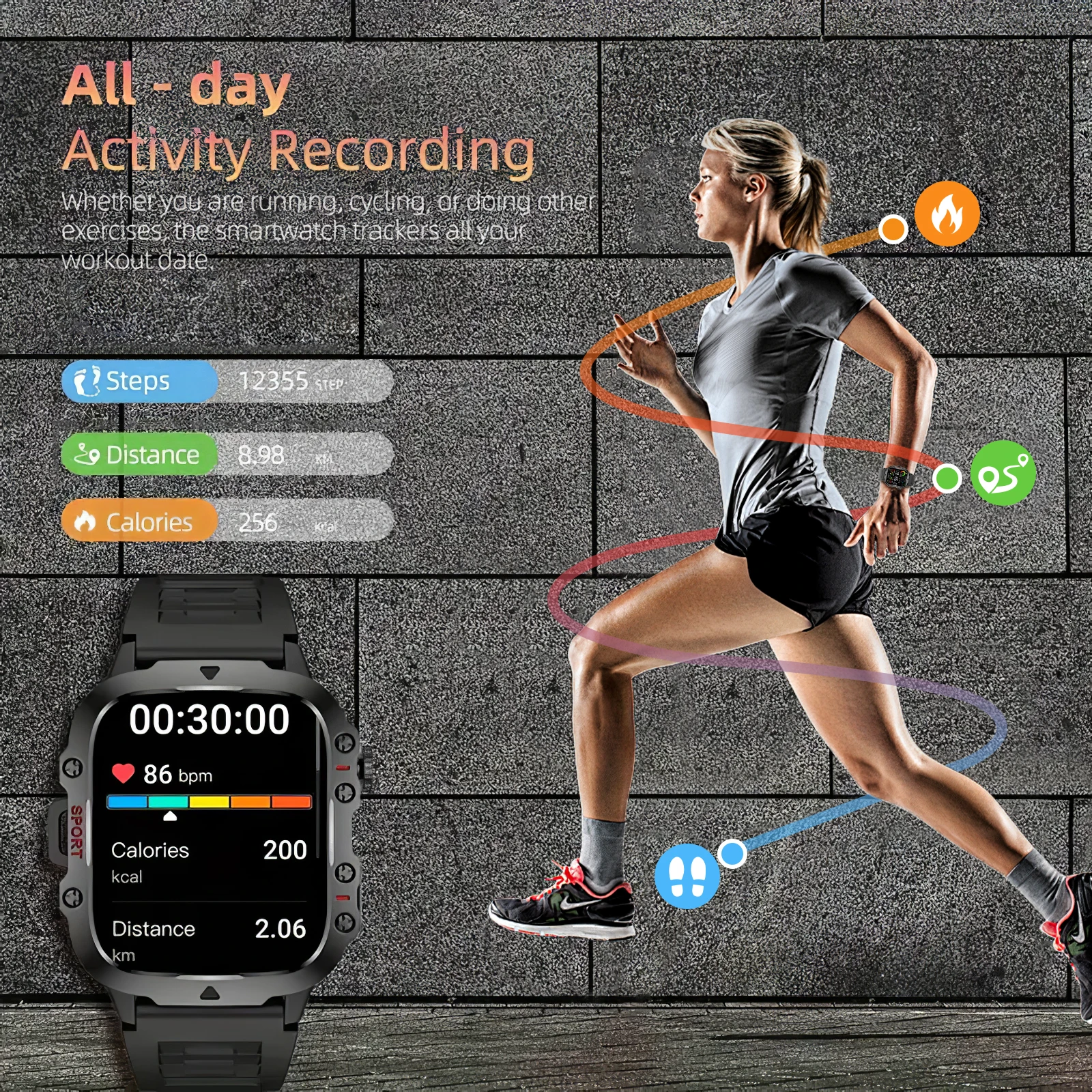 - Activity Tracked: Steps Tracker,Distance Tracker,Calorie Tracker,Activity Tracker